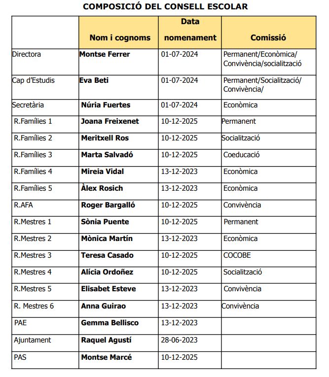 El Consell Escolar del centre és l’òrgan col·legiat de participació de la comunitat escolar en el govern del centre. En el consell escolar hi ha representats tots els col·lectius que intervenen en la comunitat educativa: director o directora, professorat, personal d’administració i serveis i famílies